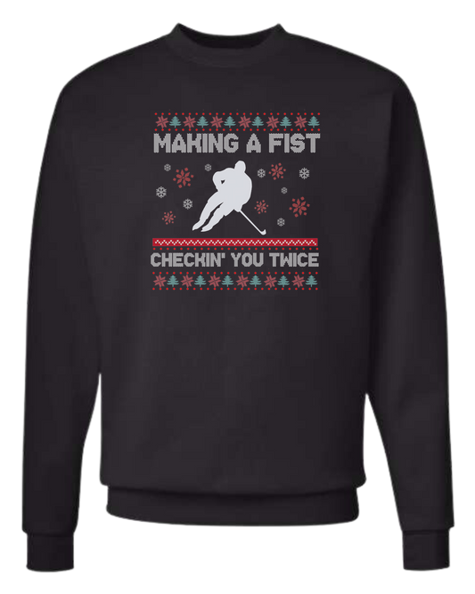 Hockey Christmas Sweater "Makin' a Fist, Checkin' you Twice" graphic Classic unisex crewneck tee