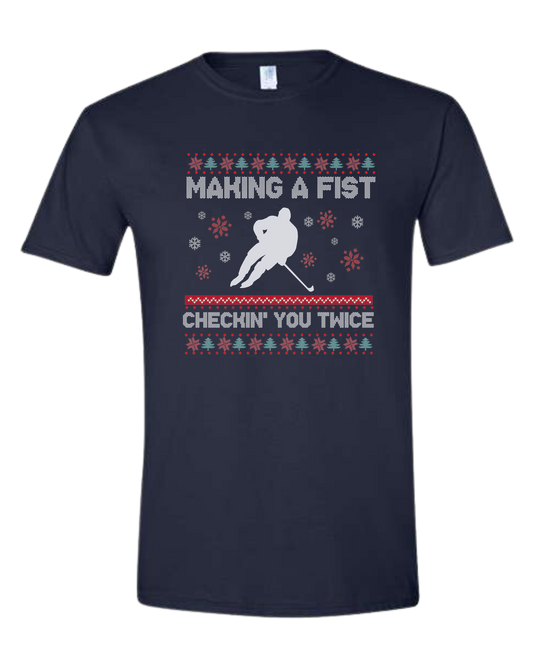 Hockey Christmas Sweater "Makin' a Fist, Checkin' you Twice" graphic Unisex crew-neck graphic tee