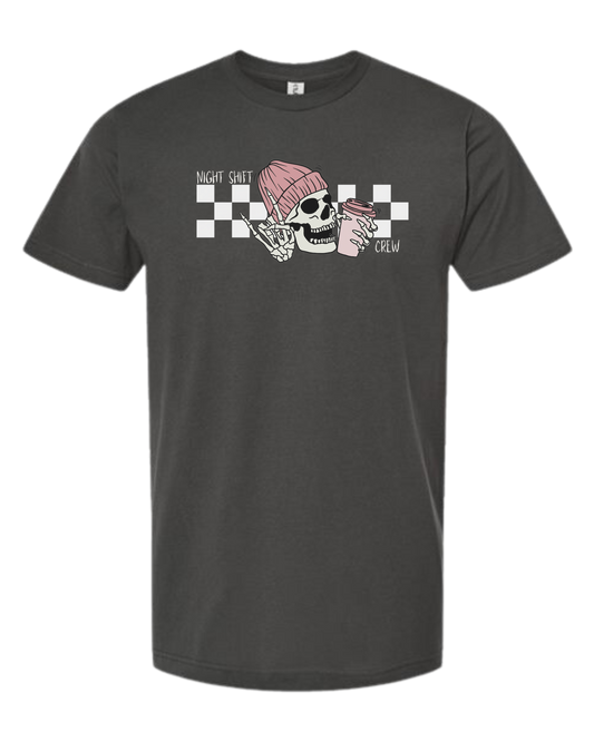 Unisex crewneck "Night Shift Crew" nursing skeleton holding coffee cup graphic tee