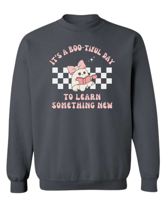 "It's a BOO-tiful Day to Learn Something" cute ghost graphic Women's fit crewneck long sleeve fit