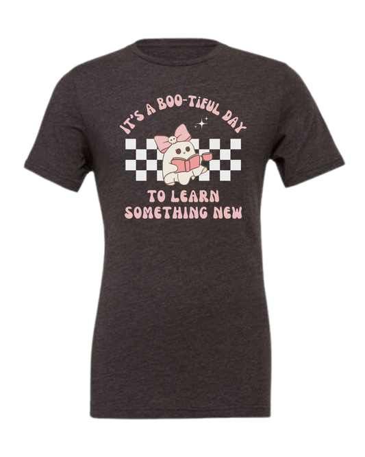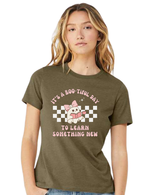 "It's a BOO-tiful Day to Learn Something" cute ghost graphic Women's fit premium crewneck tee
