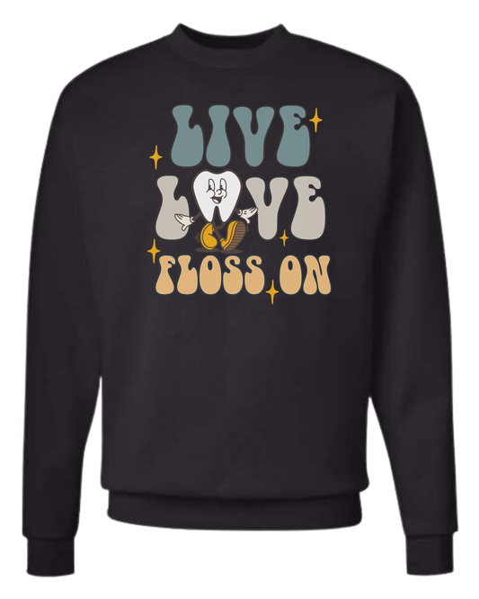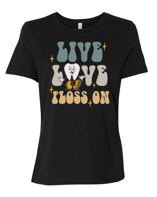 "Live, Love, Floss On" groovy text with cute tooth character Women's fit premium crewneck tee
