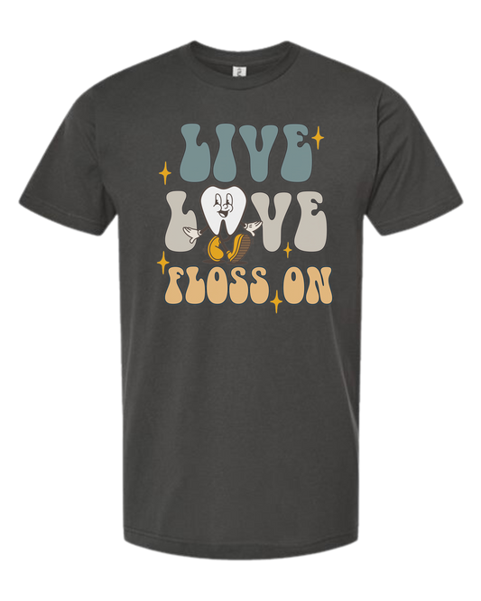 "Live, Love, Floss On" groovy text with cute tooth character Unisex crew-neck graphic tee