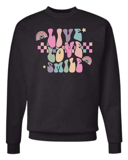 "Live, Love, Smile" multicolored groovy font design Classic unisex crewneck tee