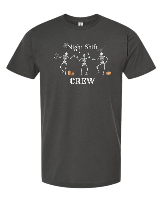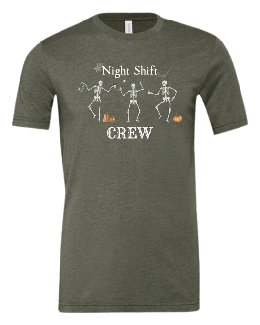 "Night Shift Crew" three skeleton nurses dancing graphic tee Women's fit premium crewneck tee