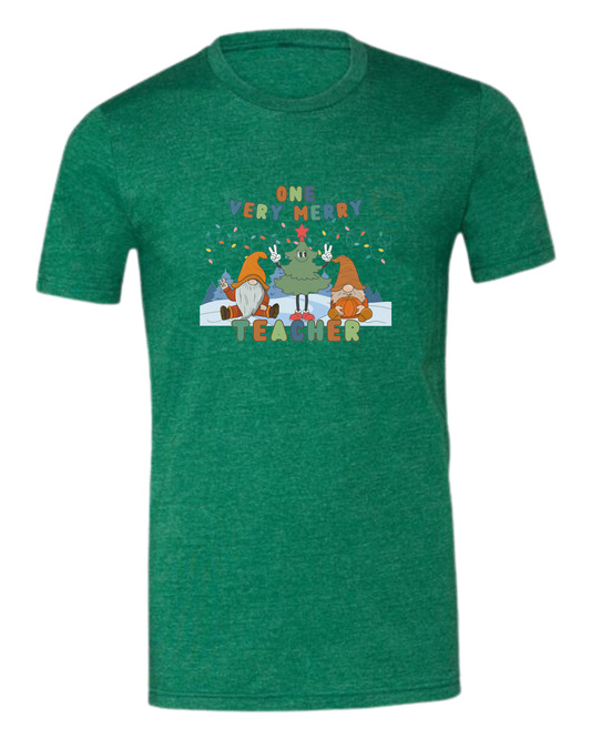 "One Very Merry Teacher" cute Christmas characters design Unisex crewneck graphic tee (light colors)
