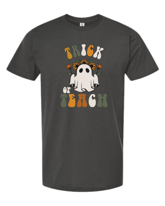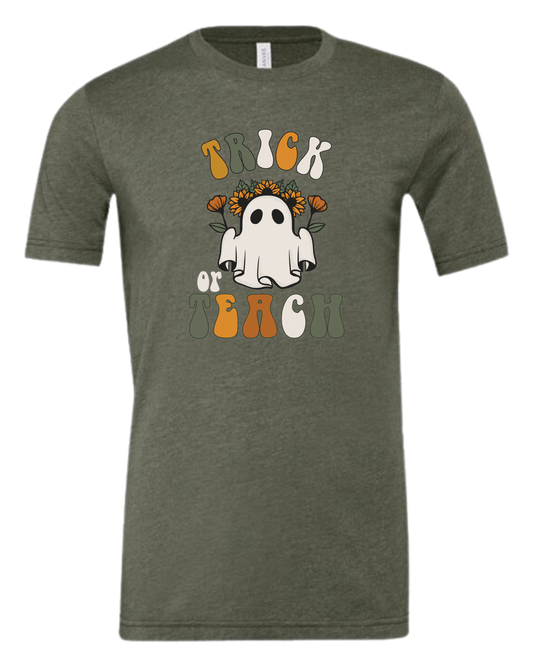 "Trick or Teach" hippie ghost retro teacher graphic Unisex crew-neck graphic tee