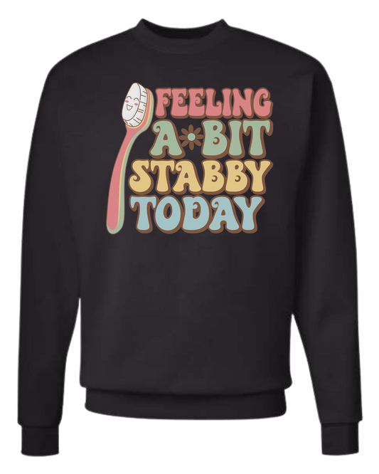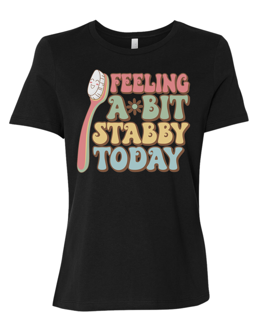 Groovy font "Feeling a bit Stabby" with large toothbrush graphic Women's fit premium crewneck tee