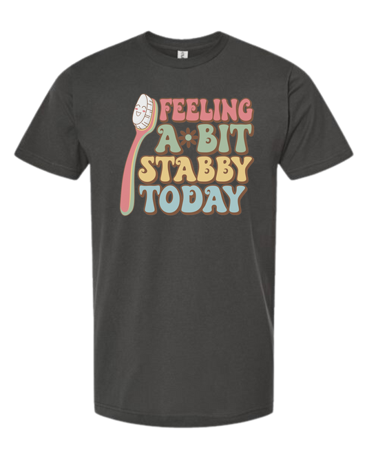 Groovy font "Feeling a bit Stabby" with large toothbrush graphic Unisex crew-neck graphic tee
