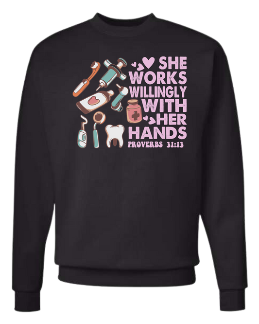 "She works willingly with her hands" dentistry graphic with cute dental supplies Classic unisex crewneck tee