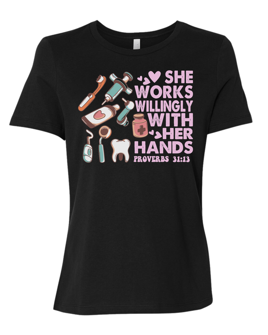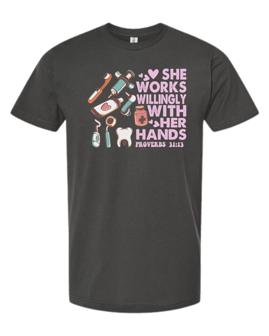 "She works willingly with her hands" dentistry graphic with cute dental supplies Unisex crew-neck graphic tee