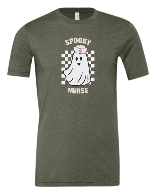 "Spooky Nurse" nurse ghost on checkerboard graphic Women's fit premium crewneck tee